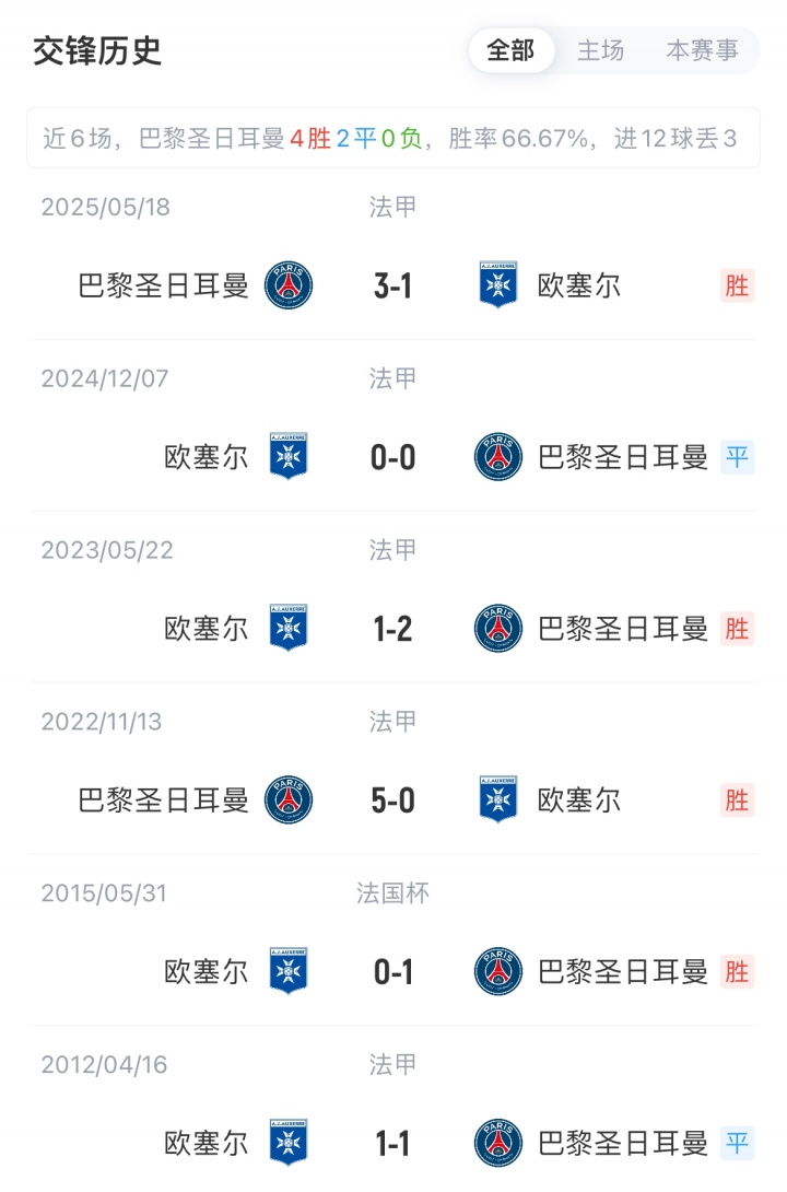 积分榜方面,巴黎4胜1负积12分,上轮0-1落败马赛;欧塞尔2胜3负积6分,上轮1-0战胜图卢兹。巴黎历史对阵欧塞尔已连续7场不败(5胜2平)。